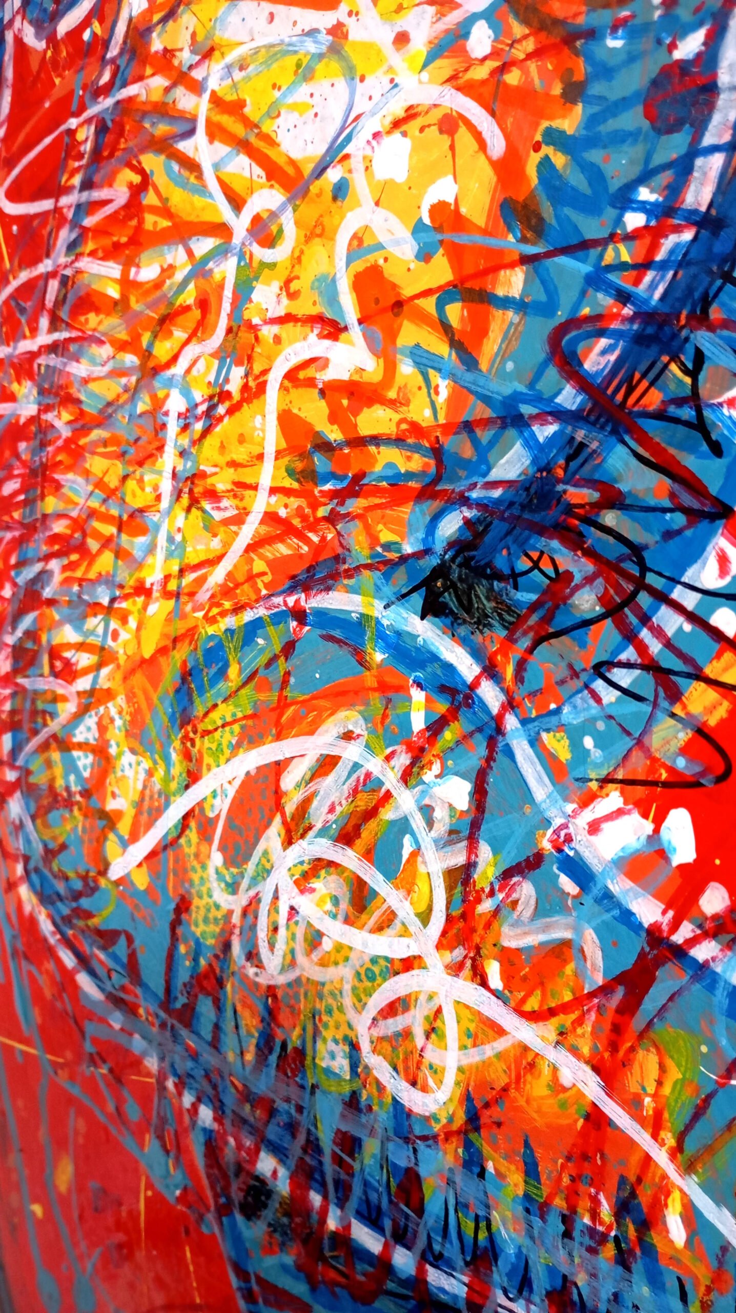 « Lola s’endort » est une toile d’orage intérieur, un maelström de gestes, de cris et de couleurs. Ici, tout déborde : le trait, le sens, le corps. Lola est prise dans un tourbillon chaotique, comme noyée sous un trop-plein de stimuli, de pensées, de connexions. On y lit l’écho d’une société saturée, où le lien se mêle au bruit.