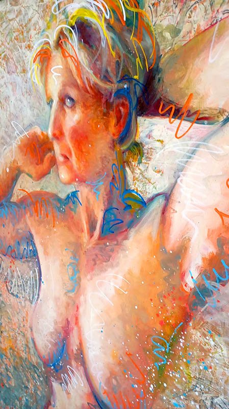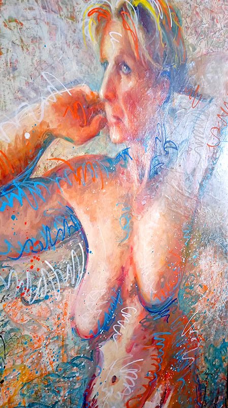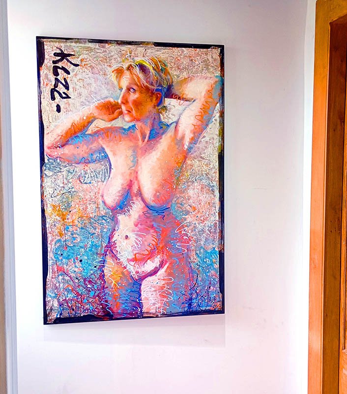 Cette toile mêle couleurs vibrantes, matière brute et énergie positive, pour donner vie à une figure à la fois intemporelle et contemporaine.